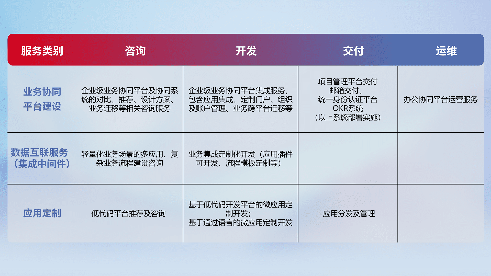 针对钉钉、、、、企微、、、、IDaas等平台级产品提供产品的规划、、、、方案、、、交付、、、、定制化开发等服务,,,,实现如统一协同办公、、智能客户服务、、混合会议管理、、、、智能数据查询、、、等业务场景,,,,实现数字化转型。。。。